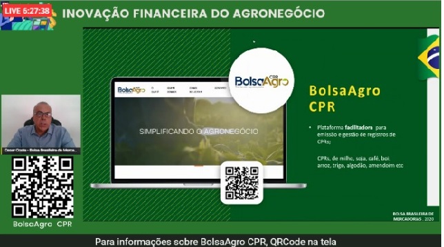 Na apresentação da Bolsa Brasileira, que dividiu painel com a Embrapa e outras empresas, o dirigente também destacou o recém-lançado BolsaAgro Seguros Agrícolas e o já consolidado BolsaAgro CPR, serviço desenvolvido para a emissão eletrônica de Cédula de Produto Rural, que possui link direto com a B3 para registros. A ferramenta pode ser utilizada por produtores rurais, cooperativas, bancos, investidores, indústrias, revendas de produtos agropecuários, traders, cerealistas e demais agentes do agronegócio.