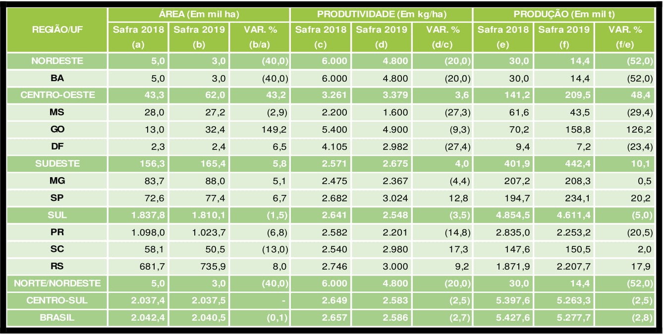 Veja abaixo o quadro com as informações da área plantada, produtividade e produção no Brasil apresentado na reunião:
