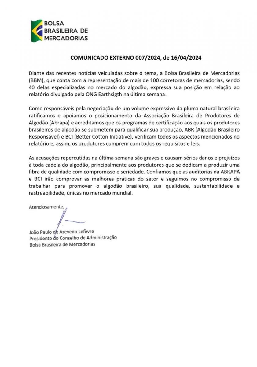 Câmara Consultiva do Algodão da Bolsa divulga comunicado ao mercado algodoeiro