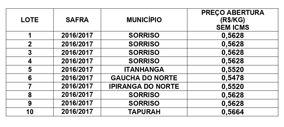 A companhia ofertará 10 lotes do grão, totalizando em 50.000 toneladas com preço abaixo de mercado. Todo o produto está depositado em armazéns de Mato Grosso.