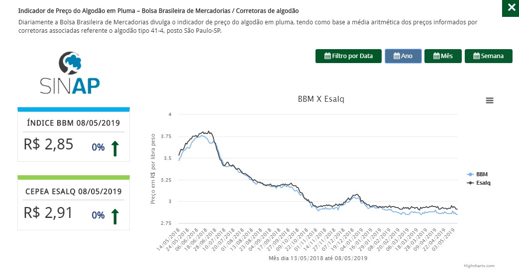 No último fechamento do indicador BBM, o algodão apareceu no patamar dos R$ 2,85. “Uma das razões para a queda de um ano para cá é o desaquecimento da demanda mundial, que foi intensificada pela disputa comercial entre Estados Unidos e China. Aliado a isso também há a superprodução nos principais países produtores como EUA e Brasil”, explica João Paulo Lefèvre da Lefèvre Corretora e presidente do Conselho Administrativo da Bolsa Brasileira de Mercadorias.