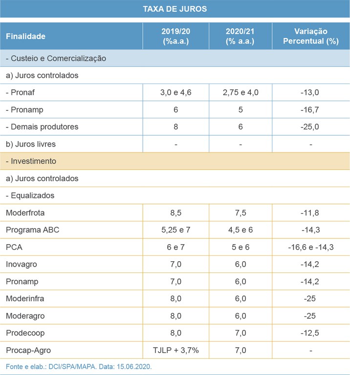 Para os médios produtores rurais, serão destinados R$ 33,1 bilhões, por meio do Programa Nacional de Apoio ao Médio Produtor Rural (Pronamp), com taxas de juros de 5% ao ano (custeio e comercialização). Para os grandes produtores, a taxa de juros será de 6% ao ano.