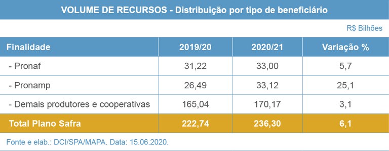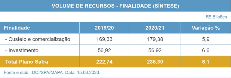Do total, R$ 179,38 bilhões serão destinados ao custeio e comercialização (5,9% acima do valor da safra passada) e R$ 56,92 bilhões serão para investimentos em infraestrutura (aumento de 6,6%). Todos esses recursos vão garantir a continuidade da produção no campo e o abastecimento de alimentos no país durante e após a pandemia do novo Coronavírus.